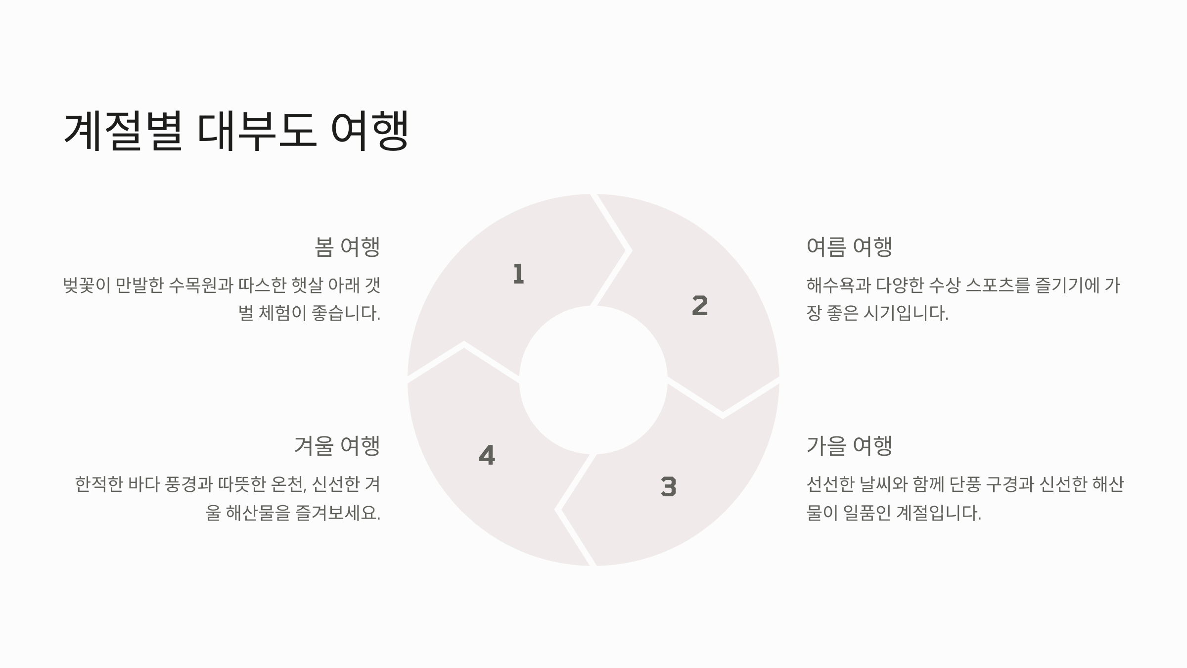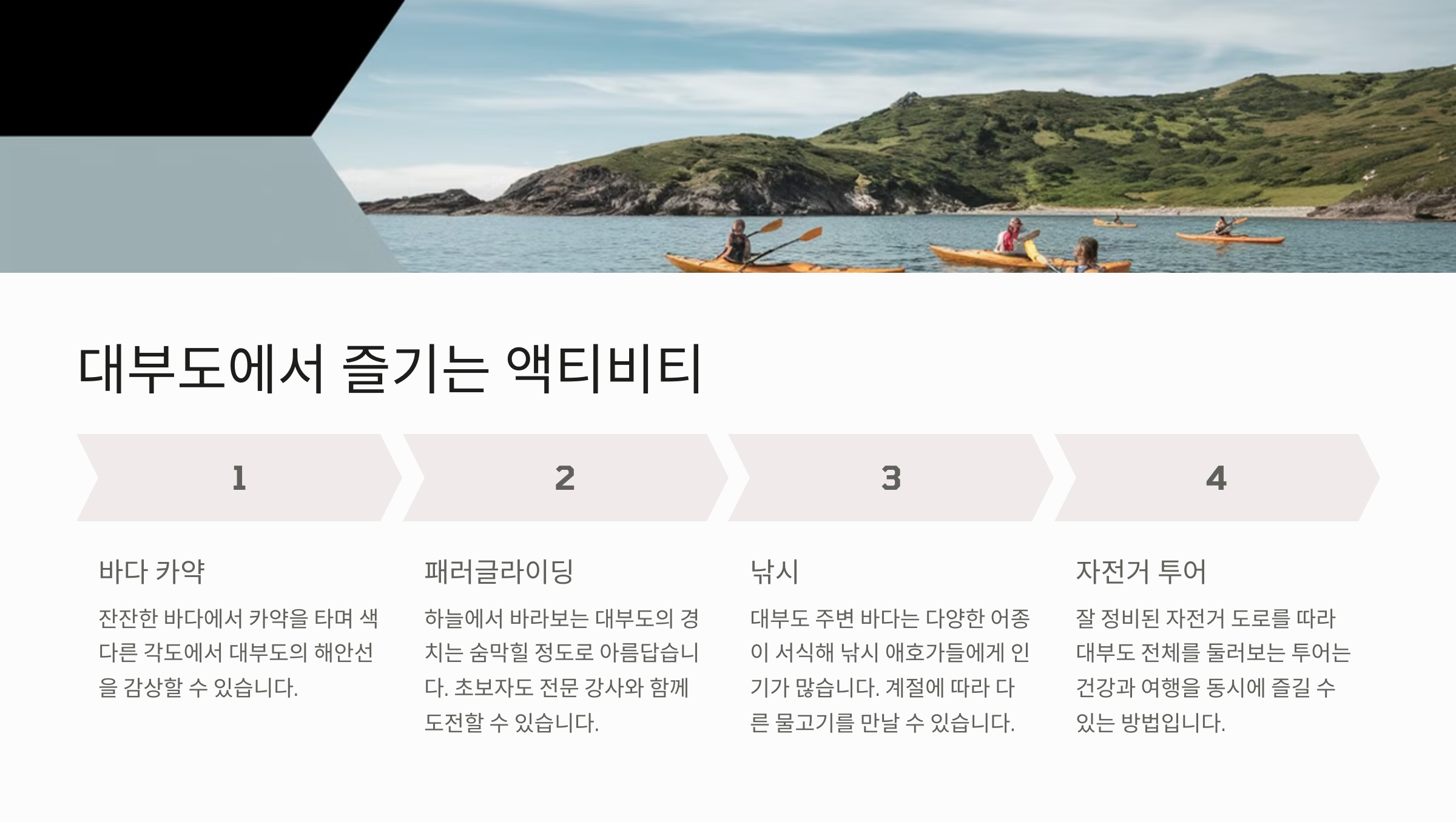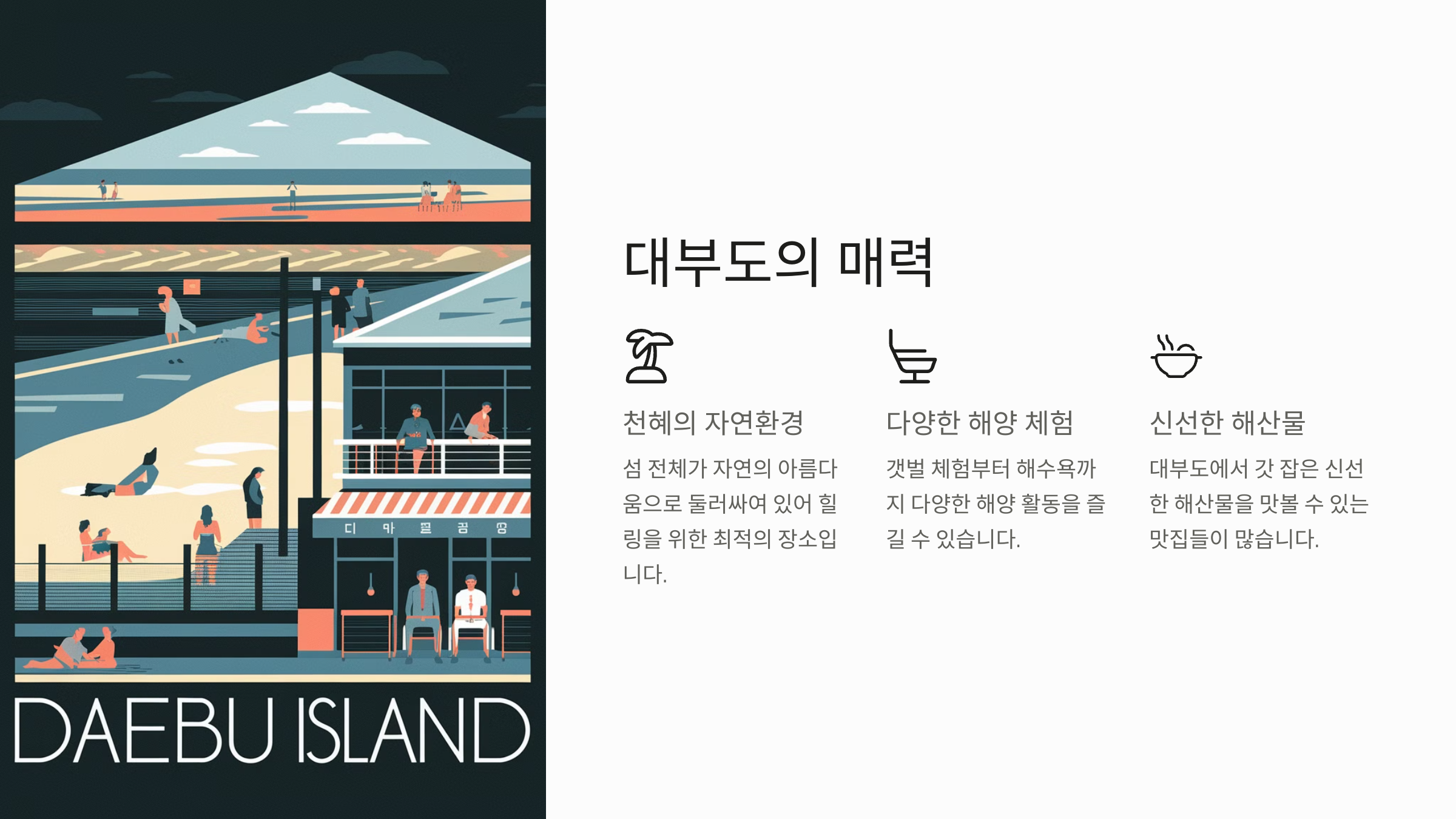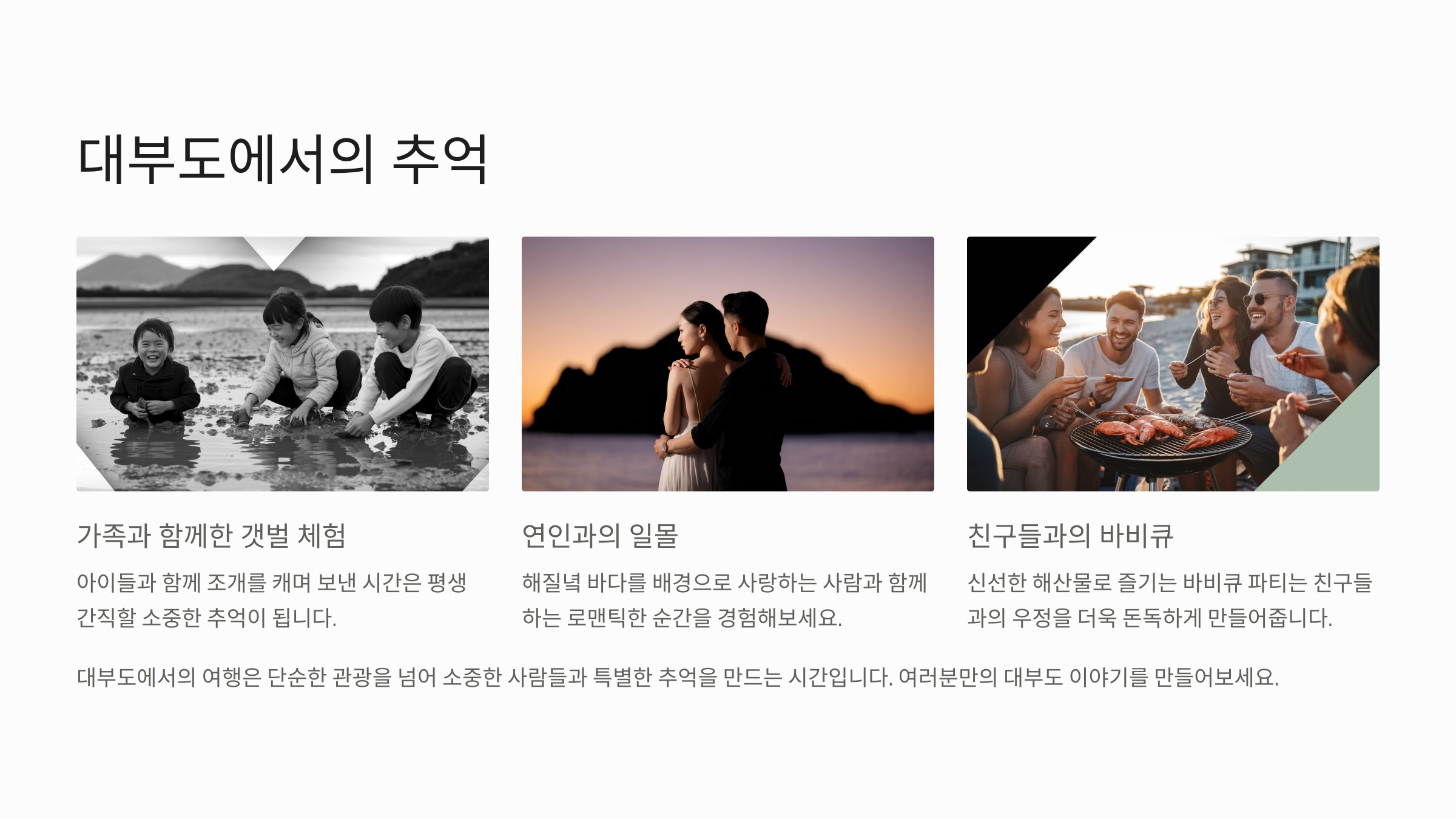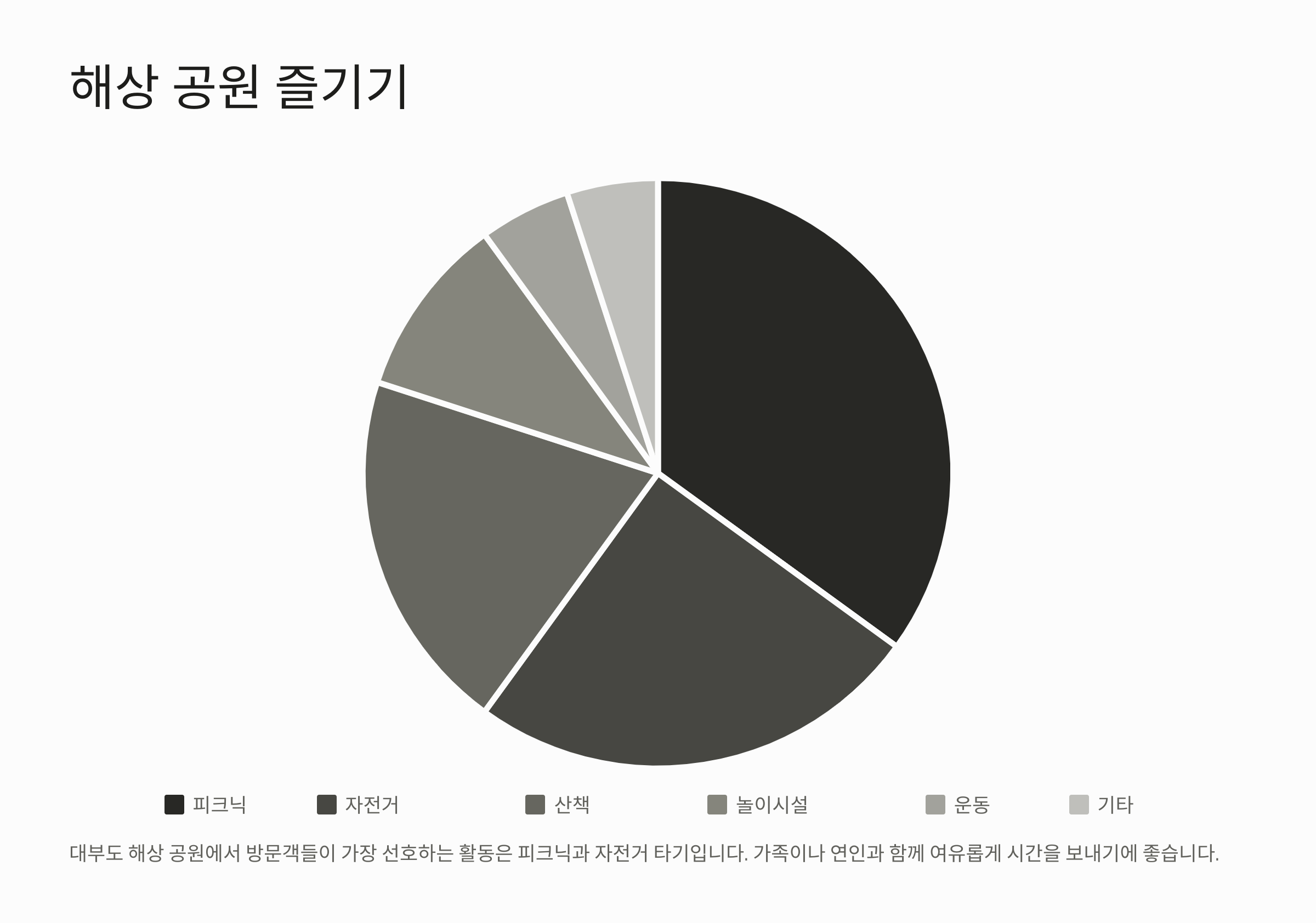 해상 공원에서는 산책로, 자전거 도로 등이 잘 조성되어 있어, 자연을 만끽하며 여유로운 시간을 보낼 수 있습니다. 또한, 바다를 바라보며 피크닉을 즐기기에 좋은 장소로, 주말에 가족과 함께 방문하기에 이상적입니다. 자연과 함께하는 편안한 시간은 대부도의 마지막 매력을 느낄 수 있는 기회를 제공합니다.