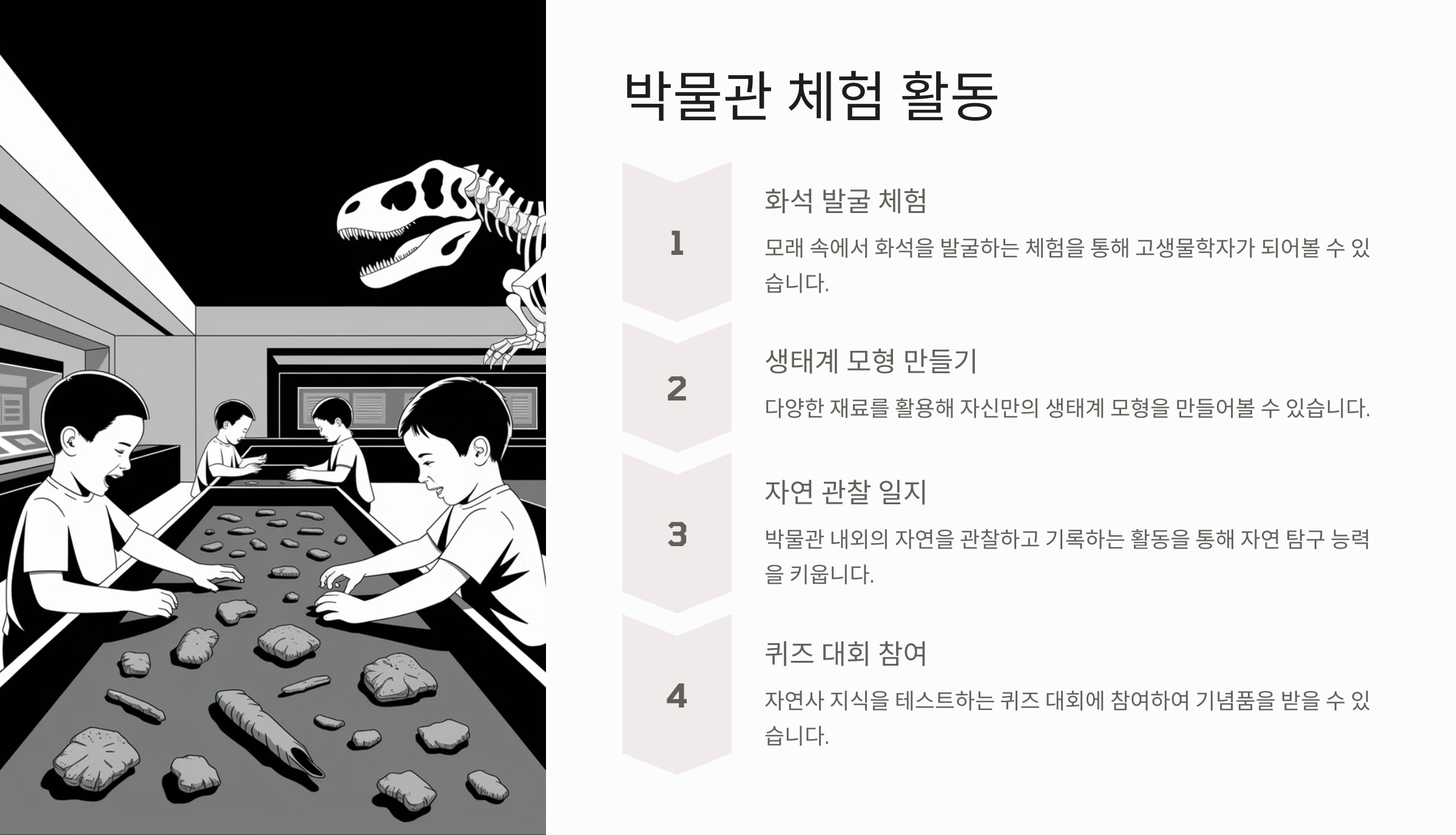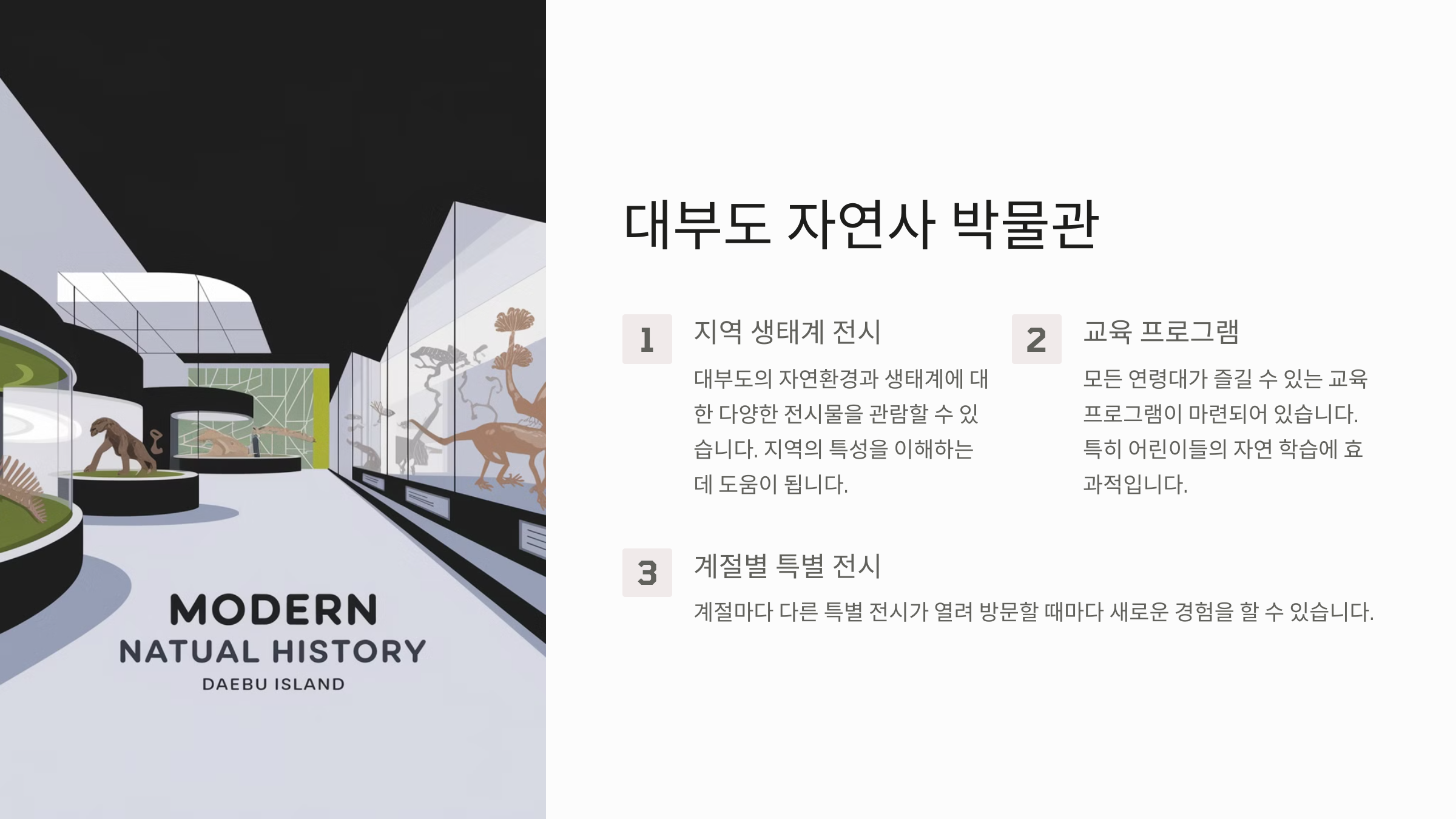 대부도 자연사 박물관은 지역의 자연과 생태계를 이해하는 데 도움을 주는 공간으로, 다양한 전시와 체험 프로그램이 마련되어 있습니다. 특히 지역 생태계와 관련된 다양한 전시물들이 있어 방문객들에게 많은 정보를 제공합니다.