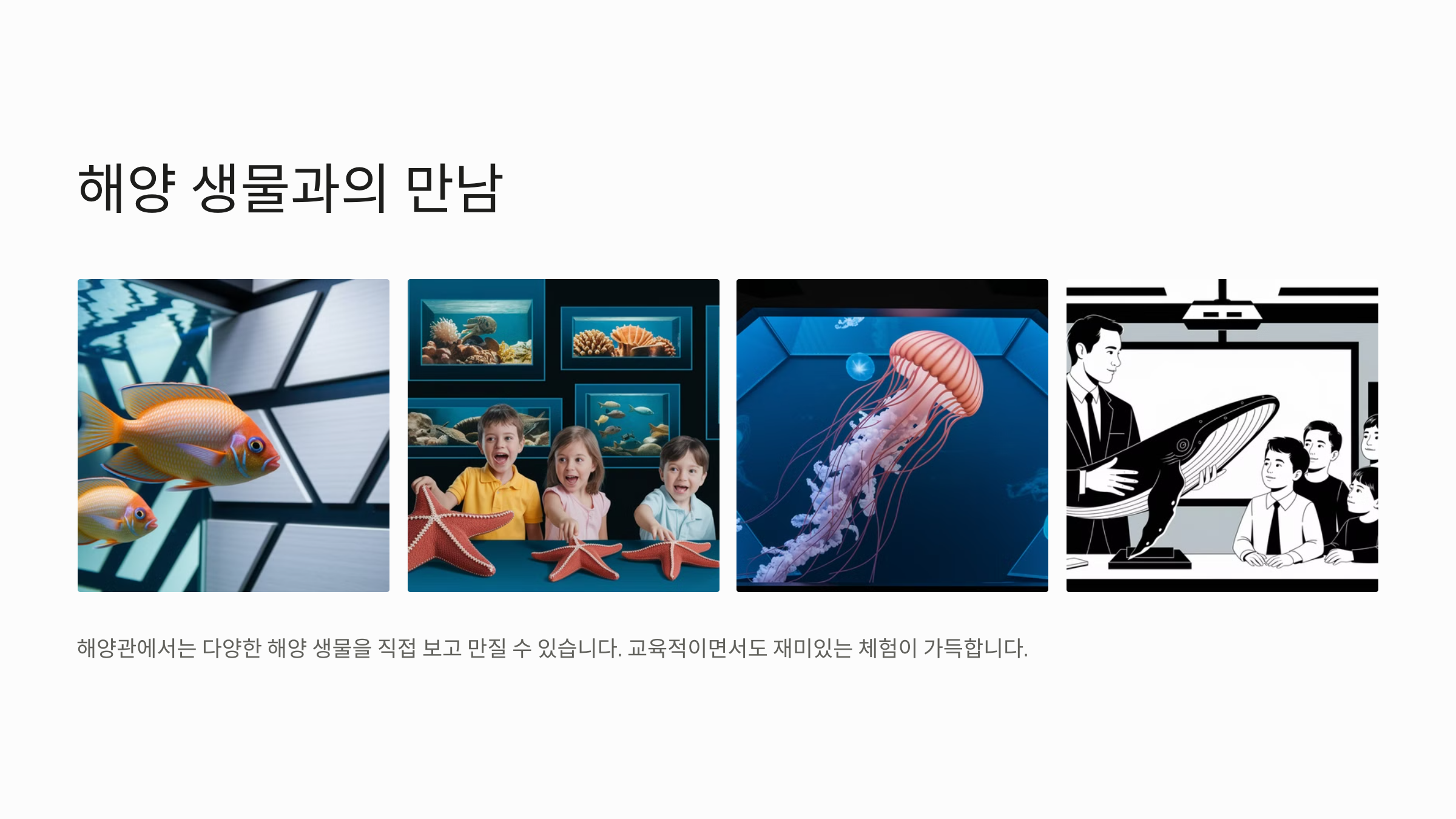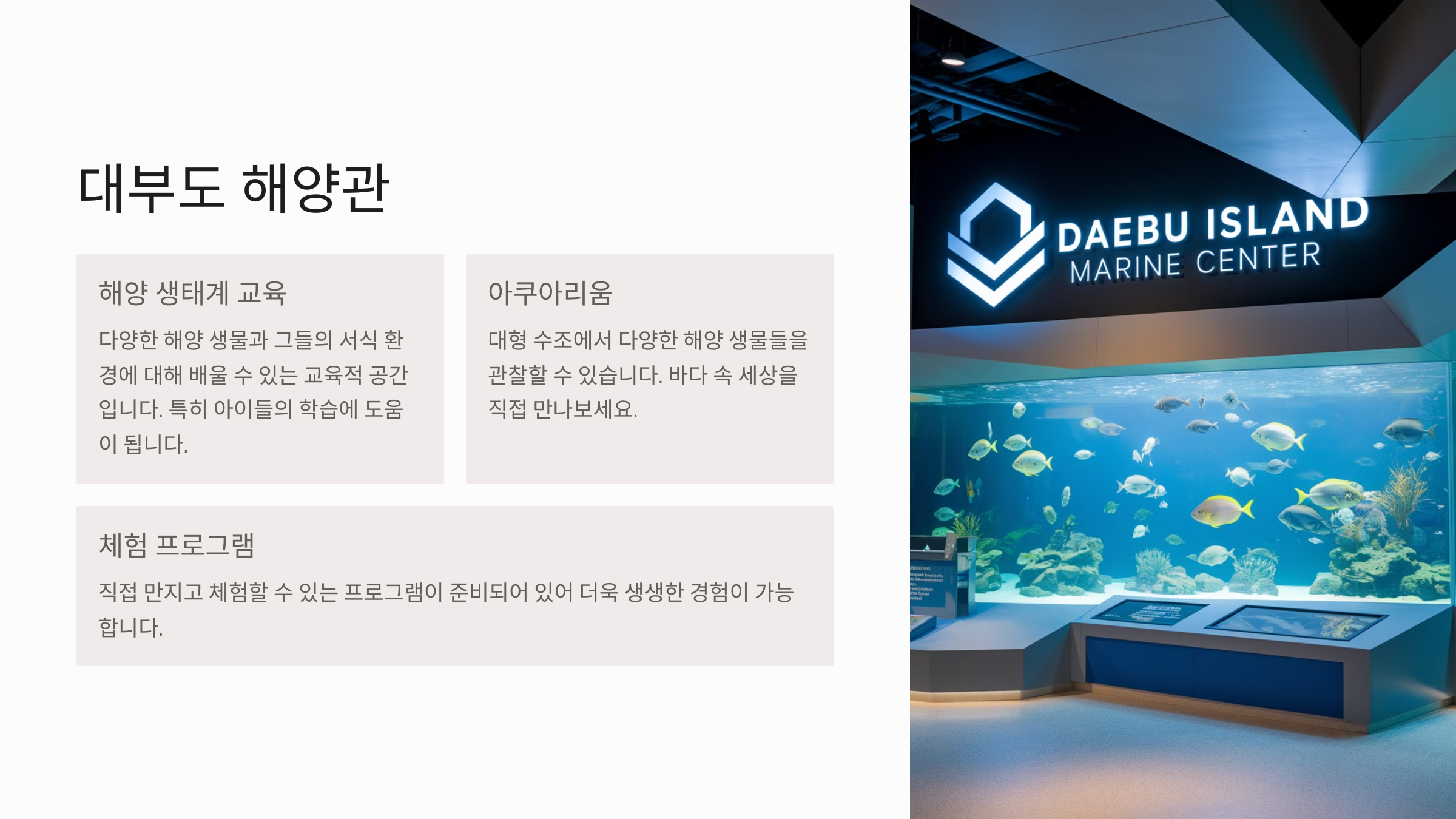 대부도 해양관은 바다 생태계에 대한 이해를 돕기 위한 교육적 공간입니다. 다양한 해양 생물과 그들의 서식 환경에 대해 배울 수 있는 좋은 기회를 제공합니다. 특히 아이들과 함께 방문하면 다양한 체험 프로그램을 통해 교육적인 시간도 가질 수 있습니다.