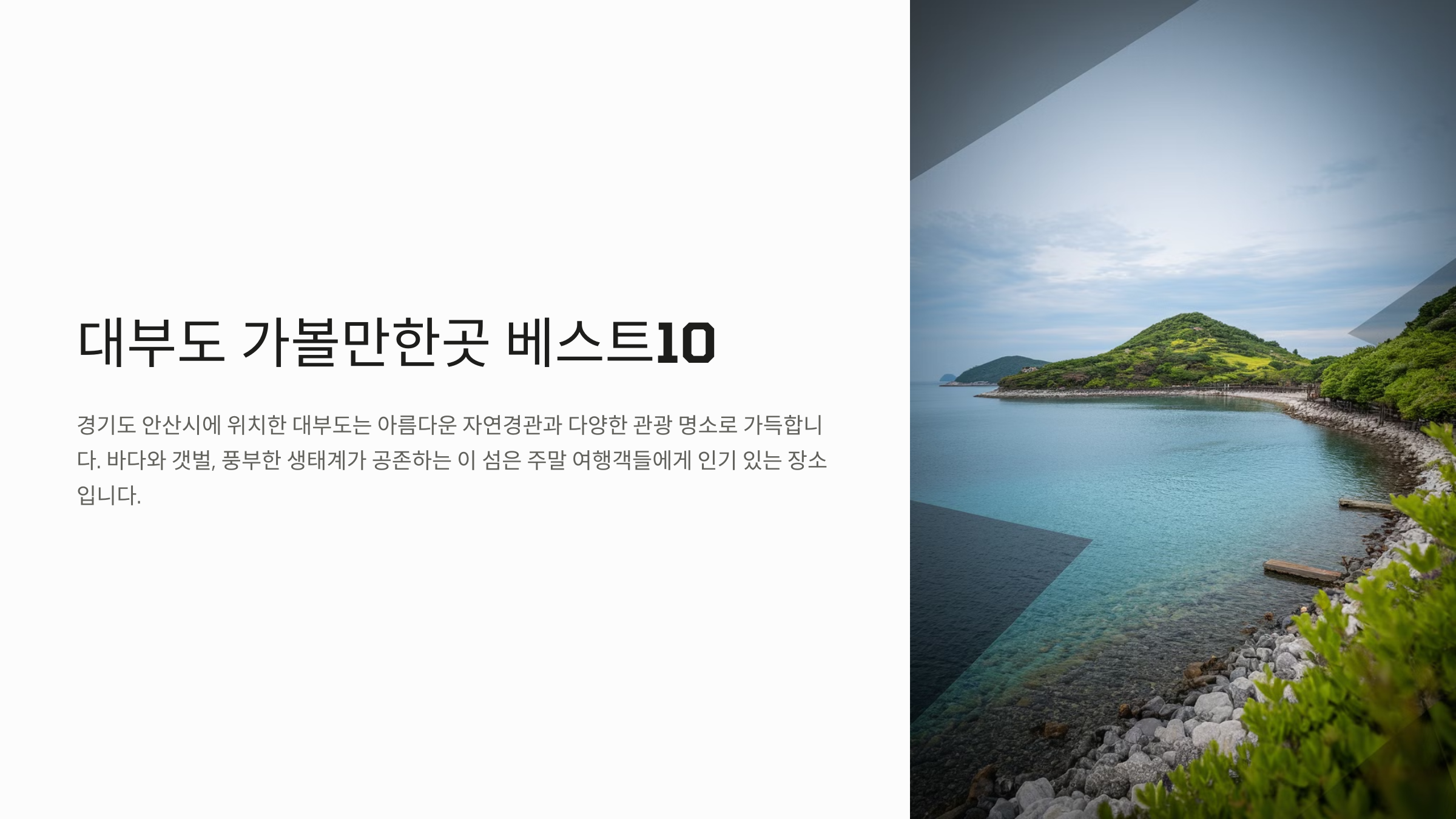 대부도는 그 자체로도 매력적인 관광지이지만, 다양한 명소들이 모여 있어 방문객들에게 풍성한 경험을 제공합니다. 여기서는 대부도의 대표적인 관광명소를 10곳 소개하며, 각 명소의 특징과 추천 이유를 설명하겠습니다.