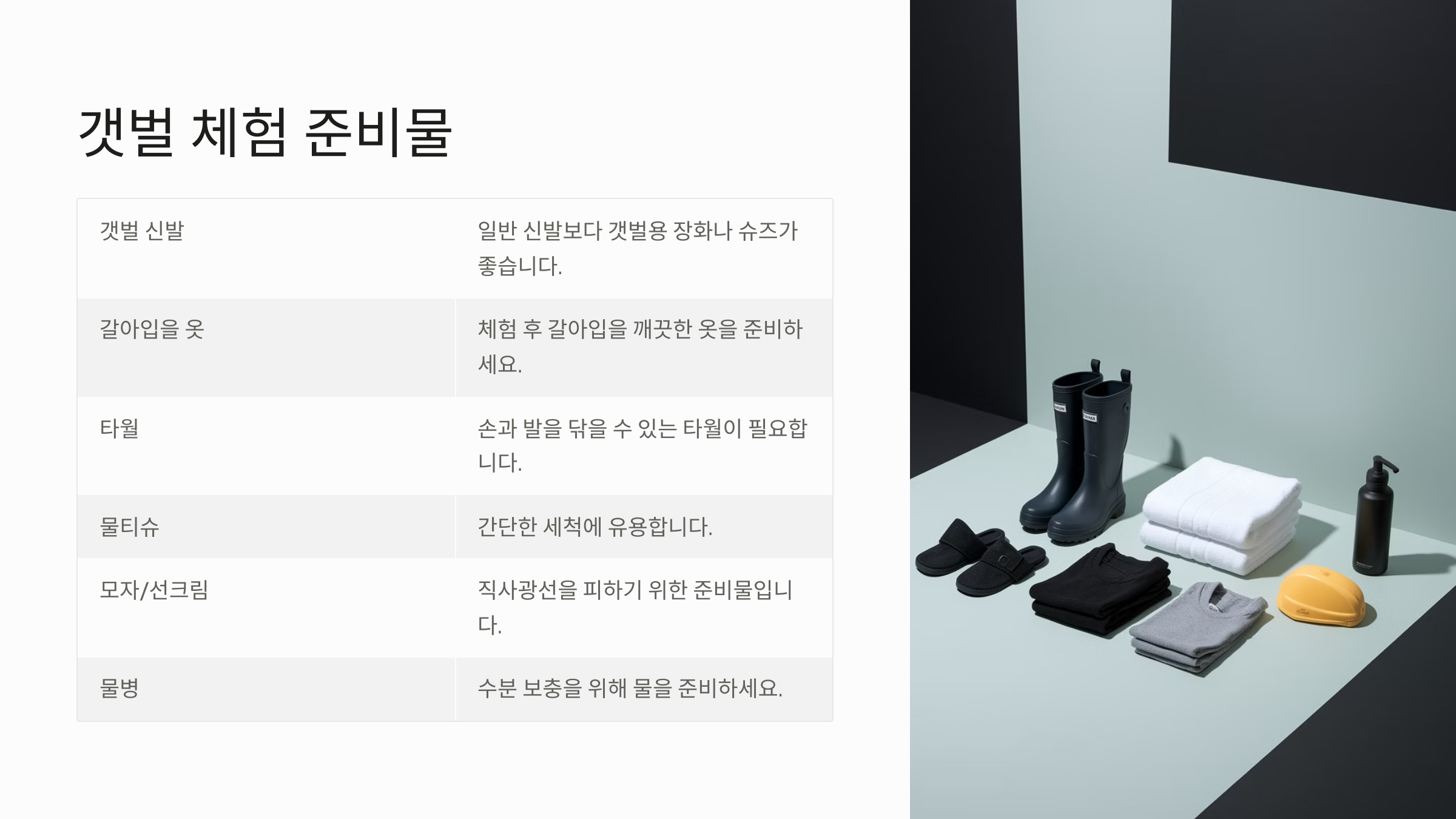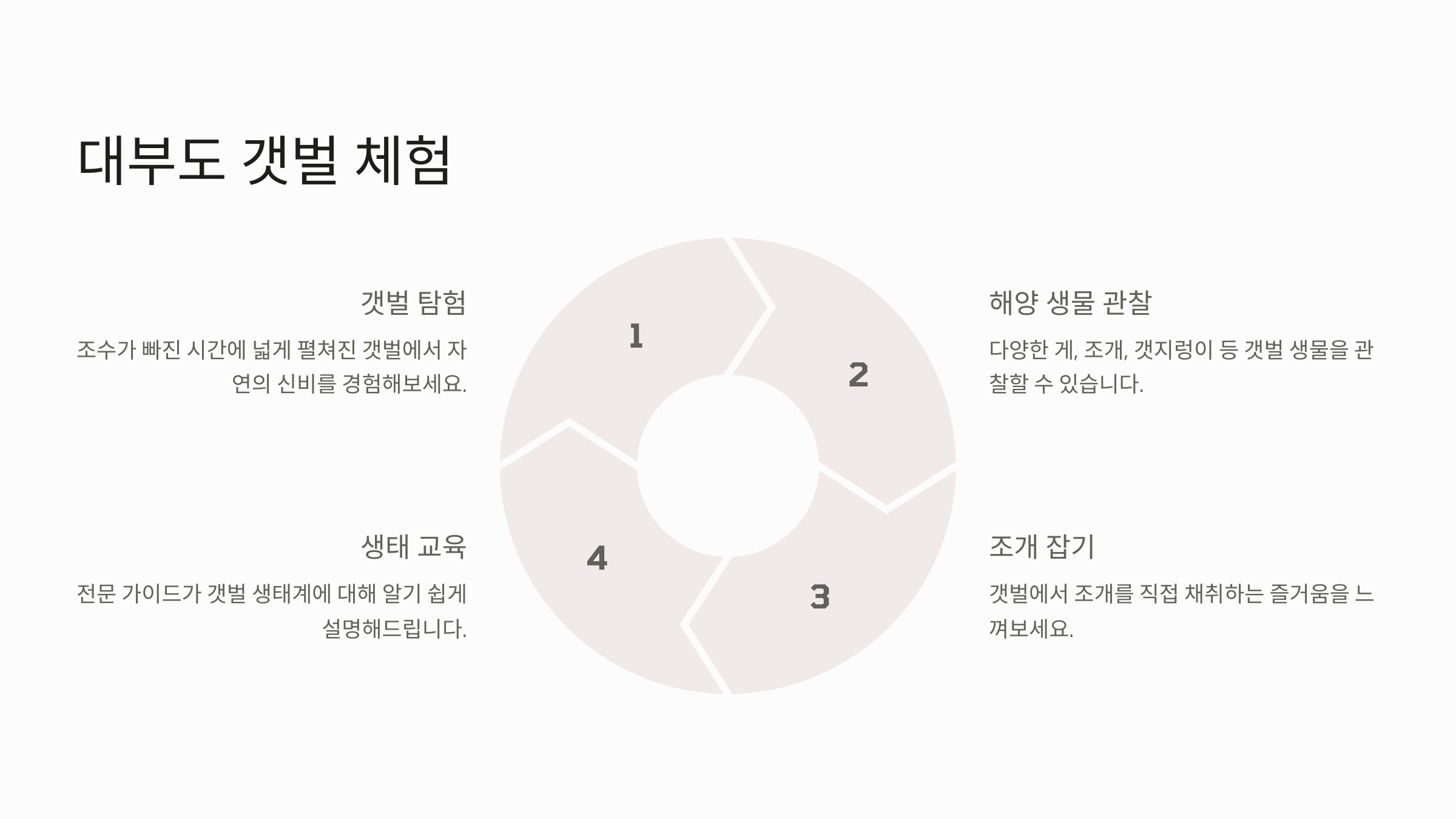 갯벌 체험은 단순한 관광을 넘어 자연과의 교감을 느낄 수 있는 특별한 경험이 됩니다. 조개를 캐고, 다양한 생물들을 관찰하며 자연의 소중함을 느낄 수 있습니다. 가족과 함께하는 즐거운 시간 동안 자연의 아름다움과 생명의 소중함을 깨닫는 기회를 제공받을 수 있습니다.