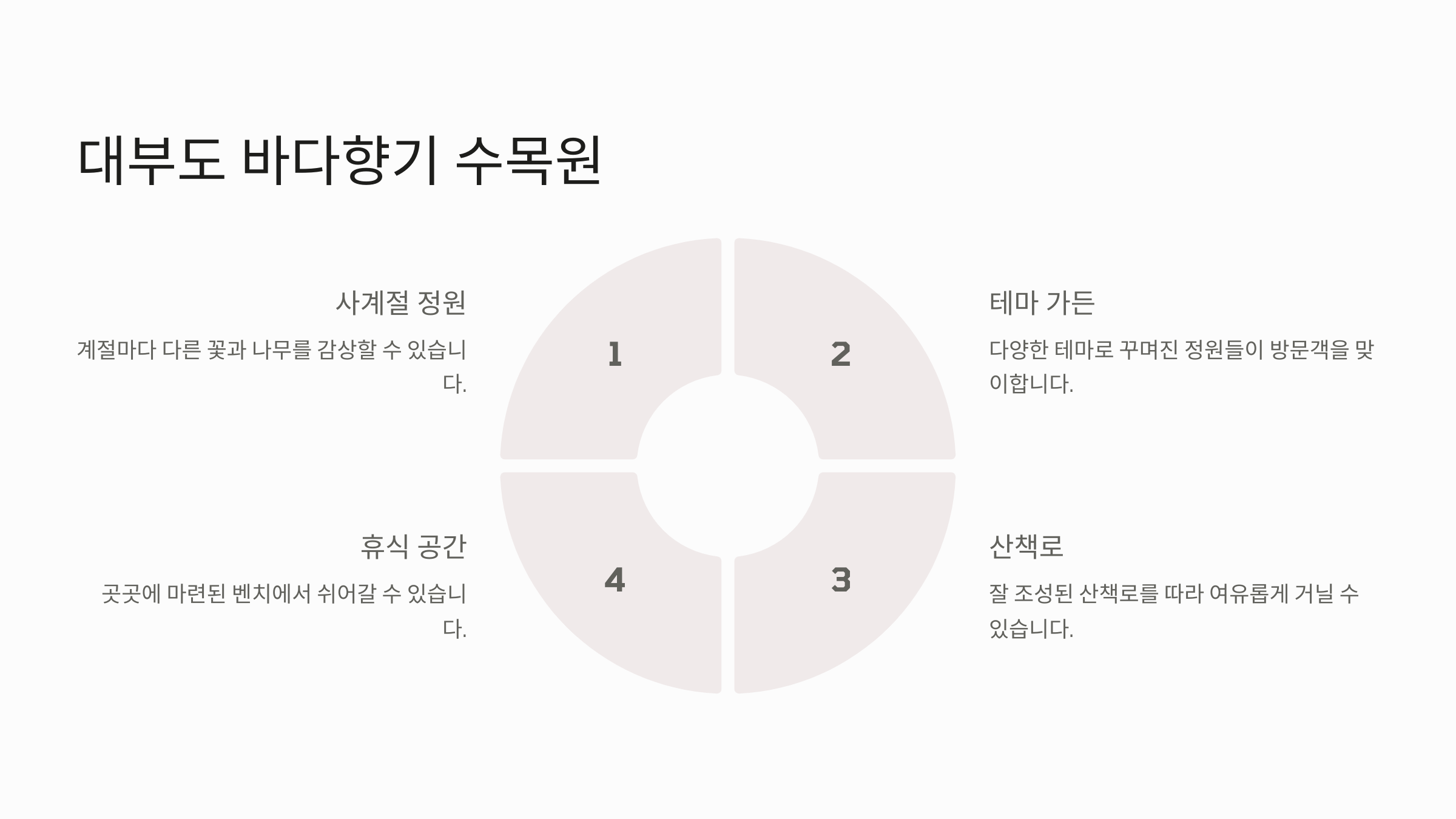 수목원에서는 다양한 식물을 가까이에서 관찰할 수 있으며, 풍성한 자연 속에서 힐링하는 시간을 가질 수 있습니다. 특히 계절마다 변화하는 수목원의 모습은 매번 새로운 즐거움을 선사합니다. 자연의 소리에 귀 기울이며 편안한 시간을 보내는 것은 대부도의 또 다른 매력입니다.