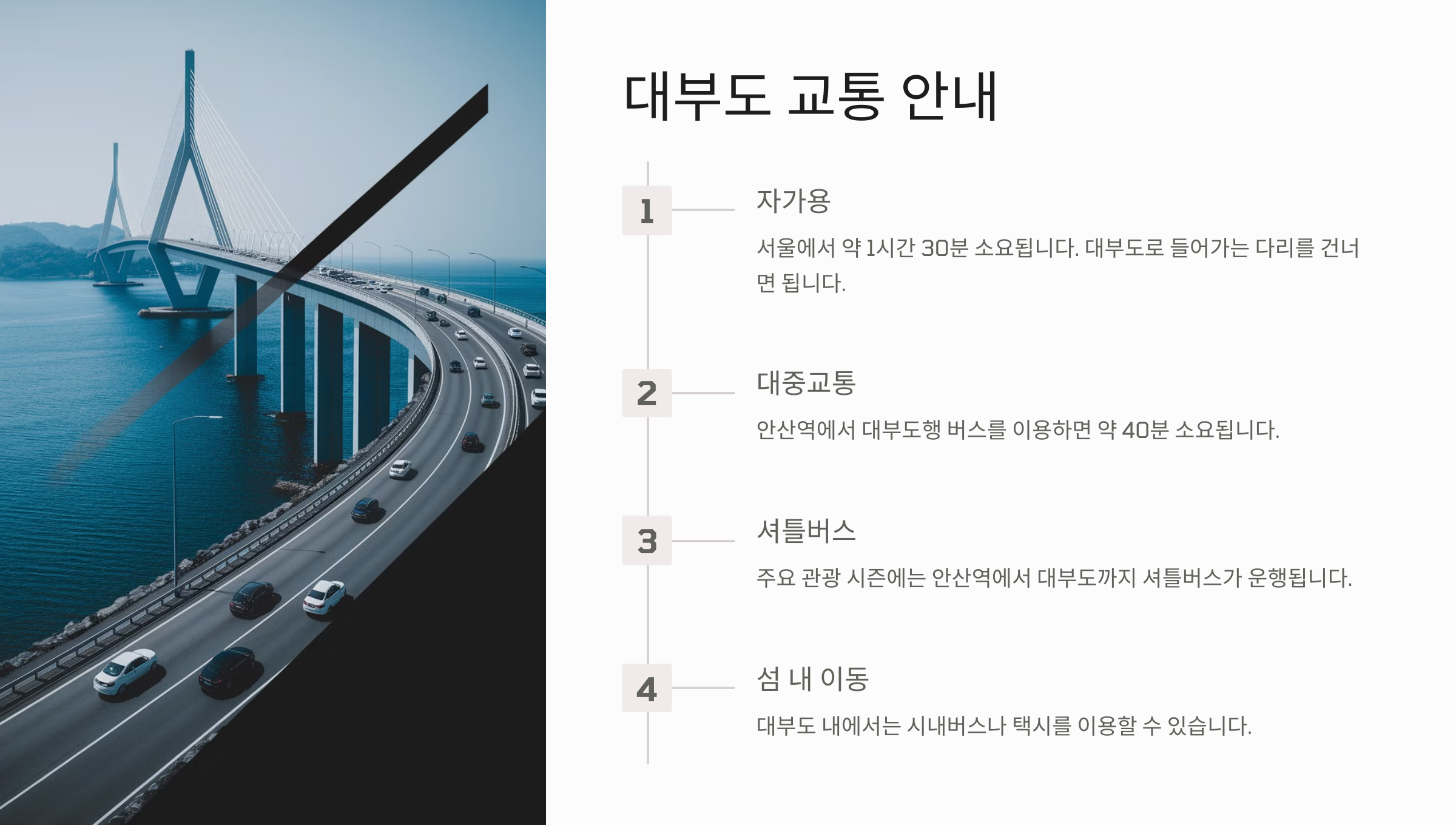 해상 케이블카는 단순한 이동 수단이 아닌, 대부도의 아름다움을 만끽할 수 있는 특별한 경험입니다. 케이블카에서 내려다보는 바다와 섬의 경치는 그야말로 그림 같은 풍경을 만들어냅니다. 이곳에서의 순간은 잊지 못할 추억으로 남을 것입니다.