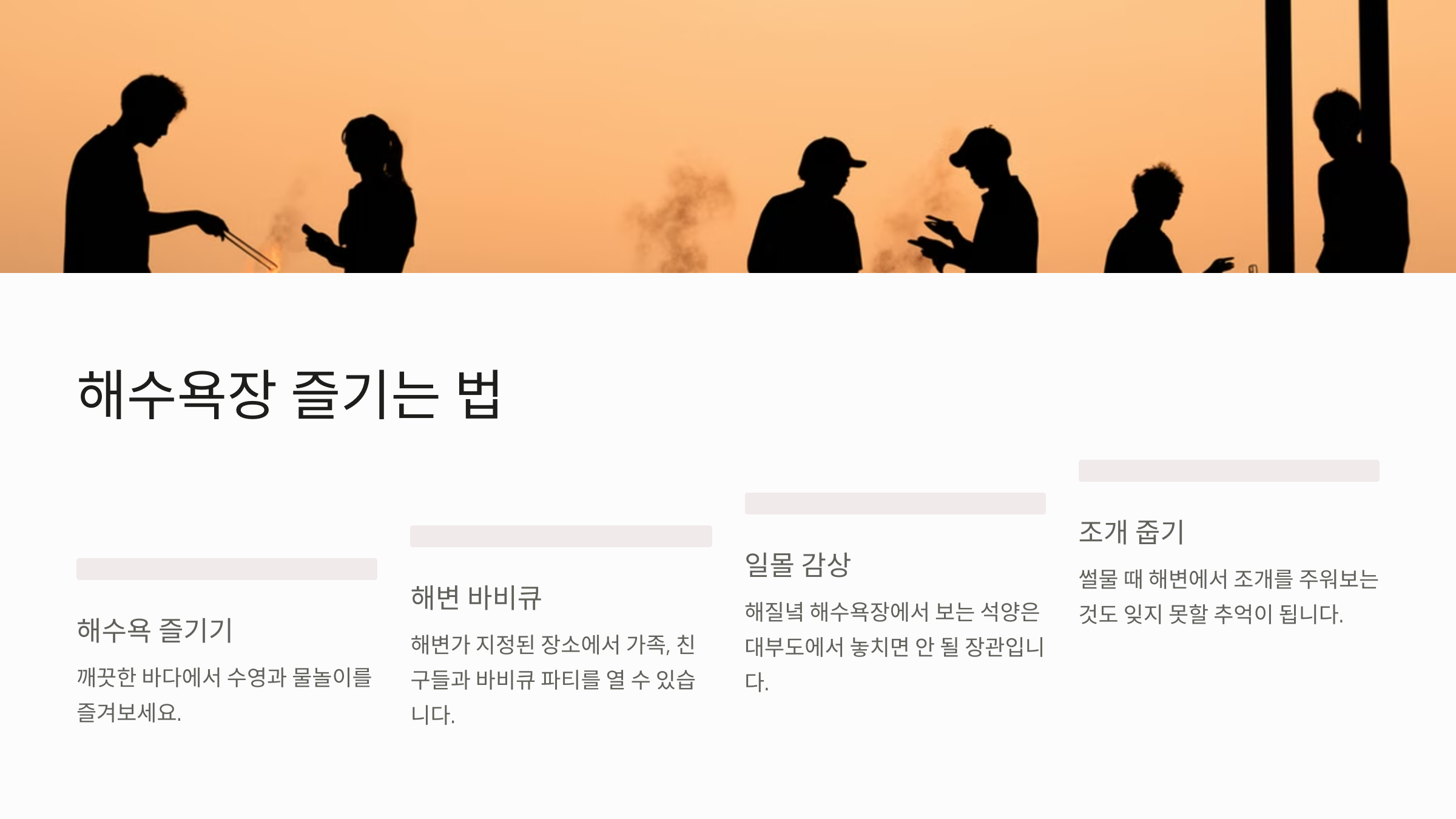 대부도 해수욕장은 특유의 고운 백사장과 잔잔한 파도로 가족 단위 방문객들에게 특히 사랑받고 있습니다. 해변가에서는 바비큐를 즐길 수 있는 공간도 마련되어 있어 친구나 가족과 함께 소중한 시간을 보낼 수 있습니다. 또한, 해수욕장에서는 카약이나 제트스키 같은 수상 스포츠를 체험할 수 있어 액티브한 활동을 원하는 분들에게도 안성맞춤입니다.