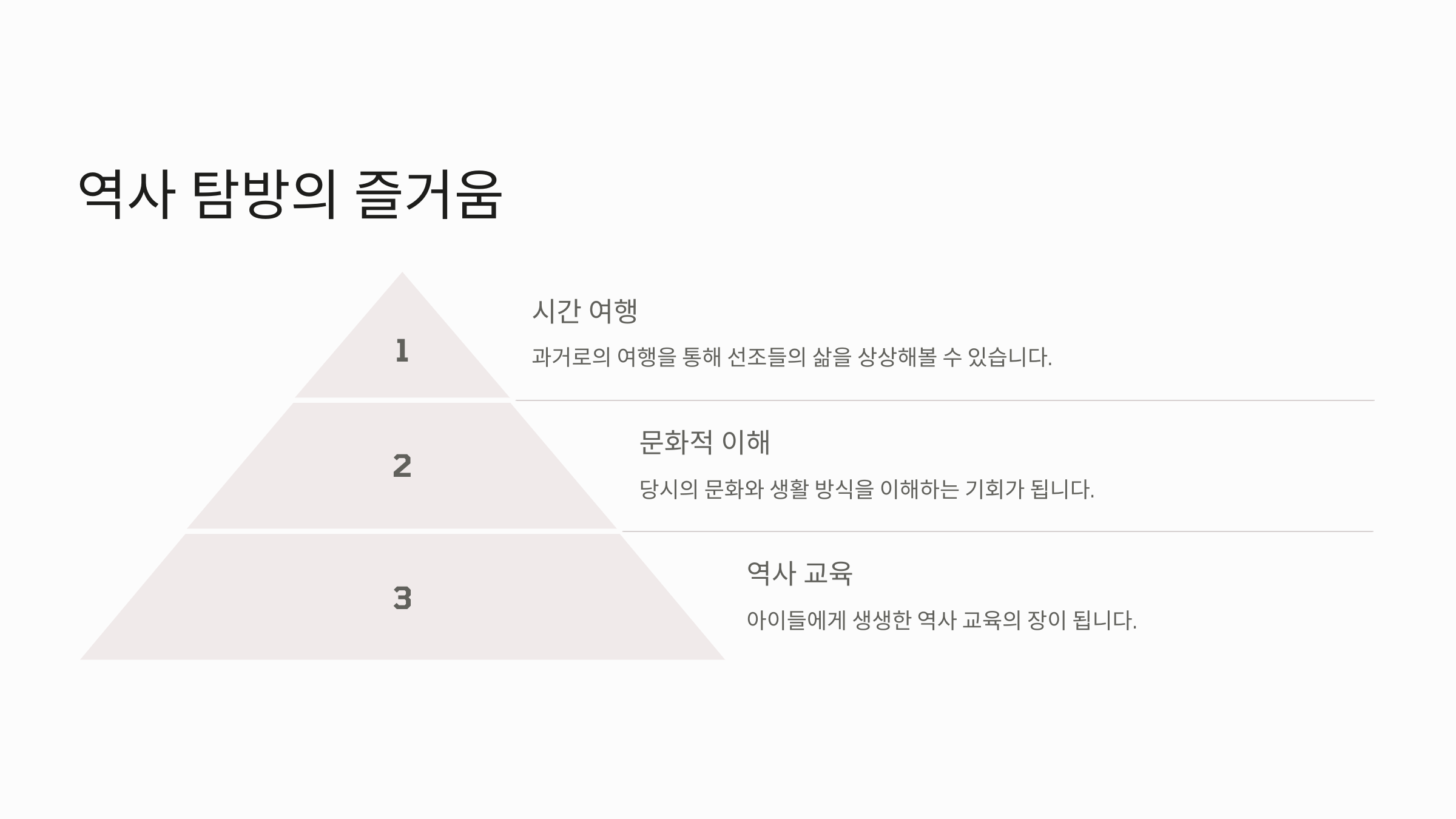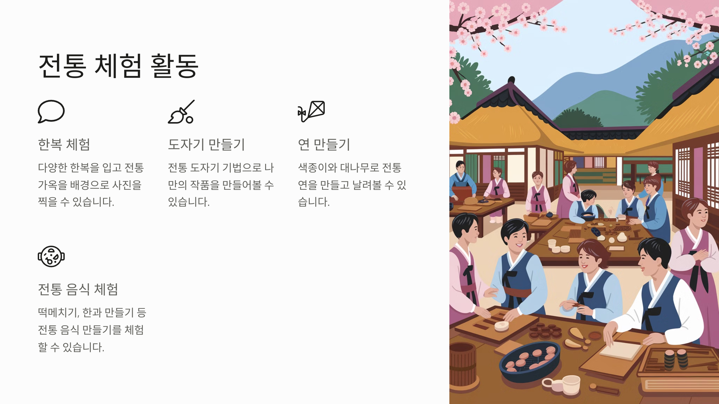 민속촌에서 다양한 전통 체험을 통해 한국의 역사를 몸소 느낄 수 있습니다. 전통 놀이, 음식 체험 등은 어린이들에게도 좋은 교육적 기회를 제공합니다. 가족 단위 방문객들은 물론, 외국인 관광객들에게도 한국 문화를 알리는 좋은 장소입니다.