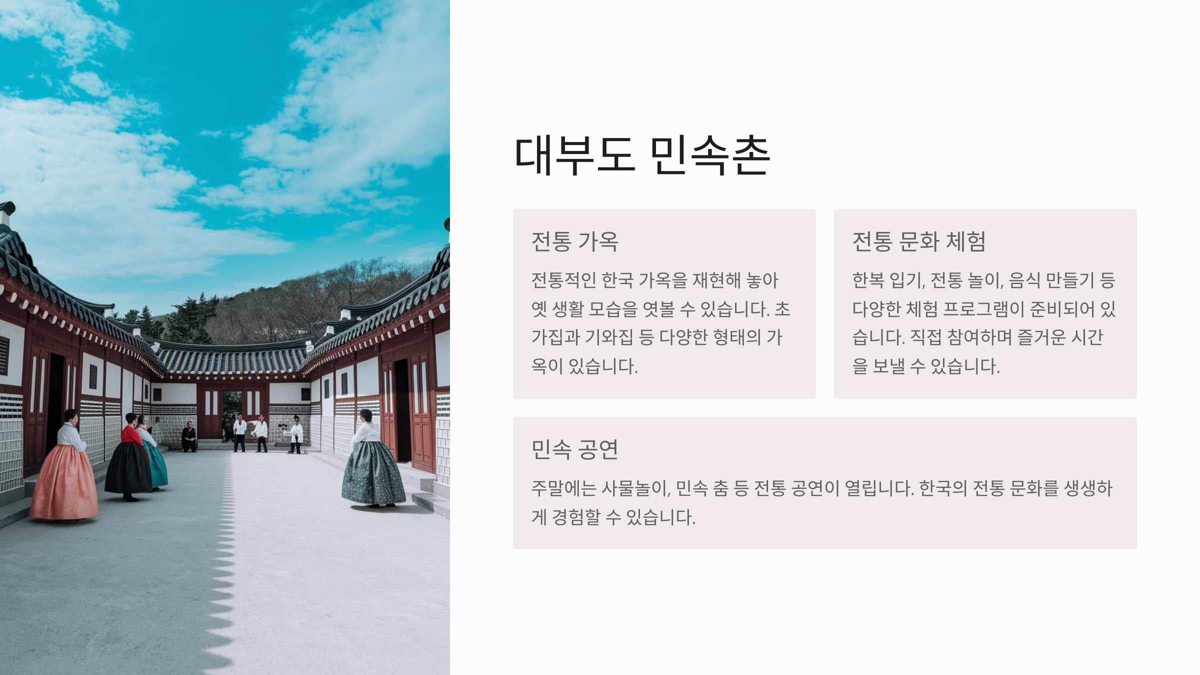 대부도 민속촌은 전통 문화를 체험할 수 있는 장소로, 옛날 사람들의 삶과 문화를 엿볼 수 있는 기회를 제공합니다. 다양한 전통 가옥과 체험 프로그램이 마련되어 있어, 방문객들은 한국의 전통 문화를 직접 느낄 수 있습니다.
