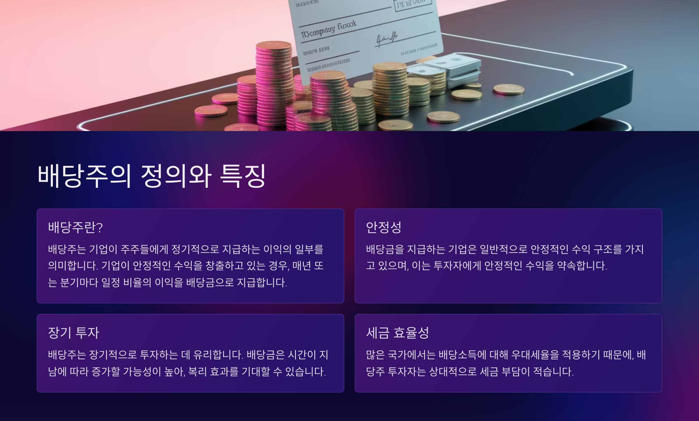 - 세금 효율성: 많은 국가에서는 배당소득에 대해 우대세율을 적용하기 때문에, 배당주 투자자는 상대적으로 세금 부담이 적습니다.