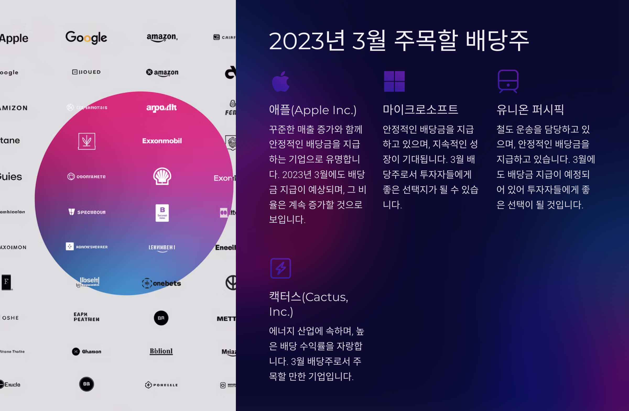 - 애플(Apple Inc.): 애플은 꾸준한 매출 증가와 함께 안정적인 배당금을 지급하는 기업으로 유명합니다. 2023년 3월에도 배당금 지급이 예상되며, 그 비율은 계속 증가할 것으로 보입니다.
